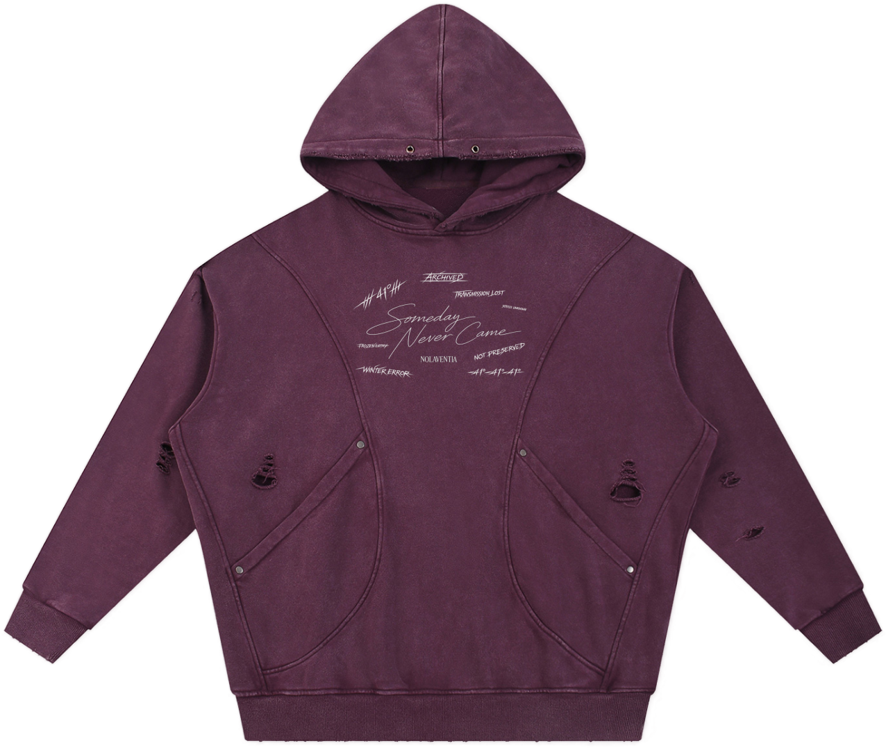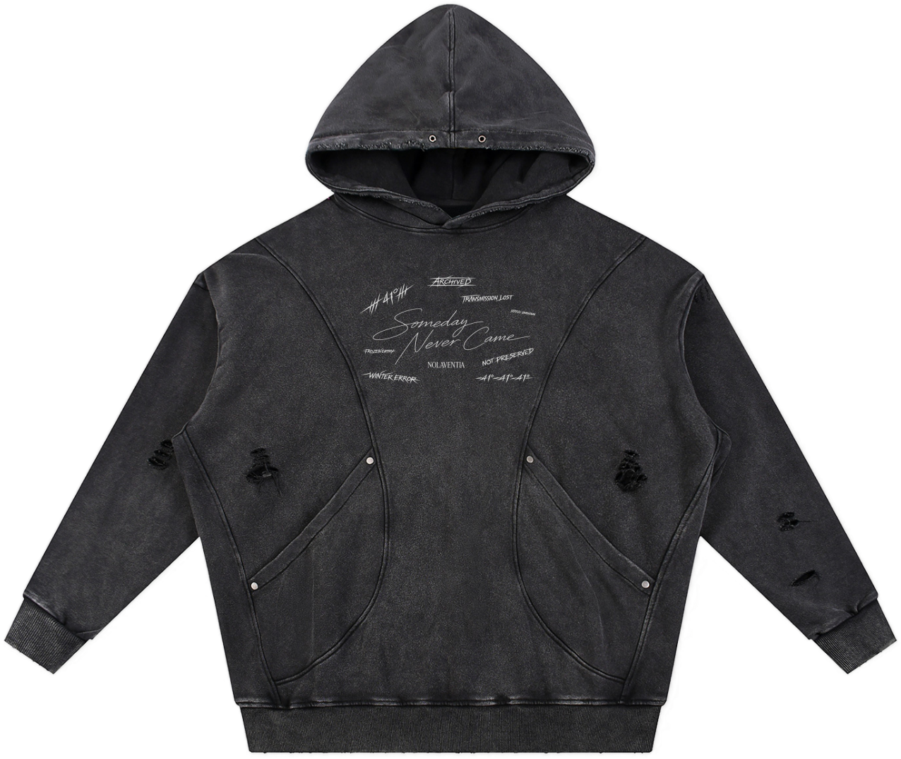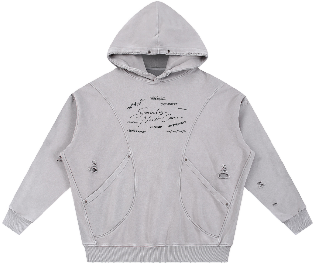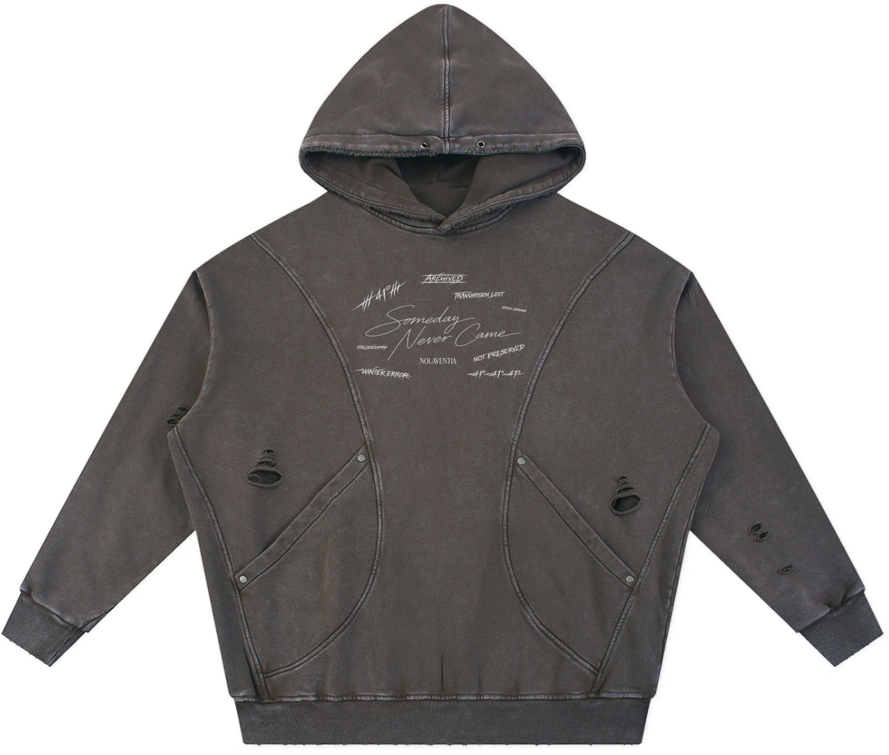 A distressed archival hoodie bearing fractured script and scattered markings, as if pulled from a corrupted system log. “Someday Never Came” layered in fading ink across a weathered surface. Built heavy. Worn like evidence. Archival.